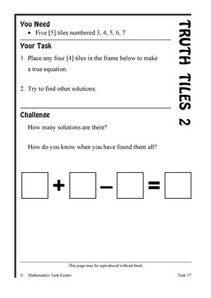 If you want to use this task in its whole class investigation life, print more (perhaps on paper this time) and make more tile sets. Or project the task card. Also it's easy to ask each pair to tear one piece of paper into 8 - five pieces for the digits, and one each for + , - and =. Find other thoughts about the whole class investigation approach in the cameo.