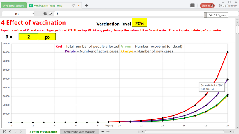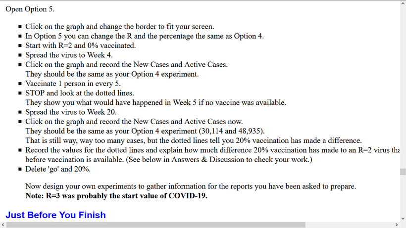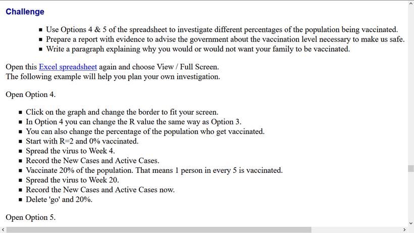This final investigation in the sequence encourages students to use software to explore percentages of population being vaccinated. Students choose their own virus virility measure and vaccination levels to gather evidence for a report to 'government' on the best objectives for a national vaccination programme.
