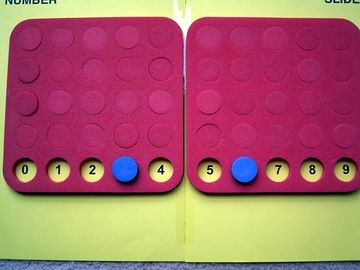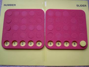 On the left is the Number Slider template provided to Calculating Changes members through the Threaded Activity with the same name (see Link List below). Two pages, a bit of tape and it's done. The image on the right shows how Poly Plug is used to create a hands on Number Slider. Non-members can easily design something similar that works for the counters or blocks they have available.
