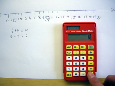 Having acted out the game invite students to return to their seats. On the whiteboard, sketch a number line from 0 - 20 (with arrowheads at each end) and from the record kept by Players A and B, invite some children, in turn, to come out and cross off the numbers in the order they were played. Circle a number (as in the photo above) when it is the answer. As this happens on the board, all students keep a running record on their calculator.