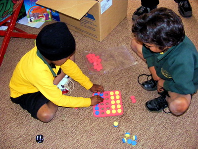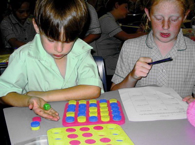 The children in Miss Suzie's class enjoyed the game very much. They were asked to keep the red plugs in the bag and take one out each time the dice was rolled. This kinaesthetic tallying added several dimensions involving more 1:1 correspondence, more counting, and experience with taking away from the number in the bag. Later, the red plugs from each group can be used to make a graph (perhaps along the edge of the floorboard) to show which number of rolls is most likely to fill the board.