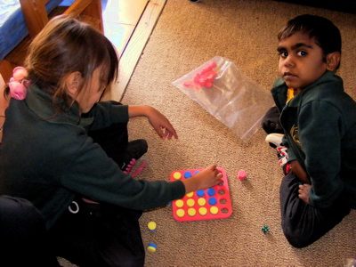 The children were initially told that they could plug in anywhere on their turn. However, after one round of the game, one group had played so that they organised their plugs into yellow and blue sets. The moment was celebrated and guess what ... next time round everyone thought it was a good idea.