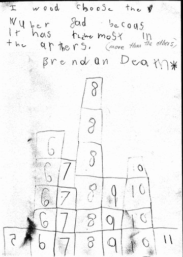 Brendan shows us how his class made a graph of the class results by using squares of card. He also explains his reasoning for choosing 8 as the most likely number of rolls.