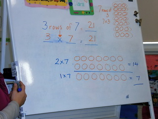 1. Encourage children to see 3 rows of 7 as 3 x 7 and further encourage them to see 3 x 7 as 3 x 5 + 3 x 2.