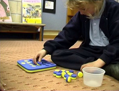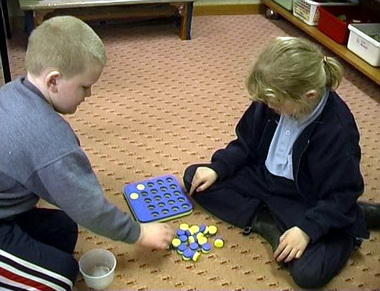 One player is yellow and one is blue. The activity is easier for children to visualise if it is played in a red board. As the photos show, if you play in the yellow/blue board one player's colour blends with the background of the board.
