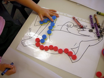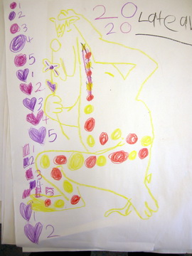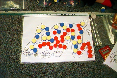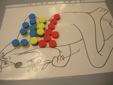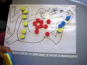 The teacher drew a likeness of the creature, minus the spots, and enlarged it to A3 size to be used by two children with a Poly Plug set and a calculator.