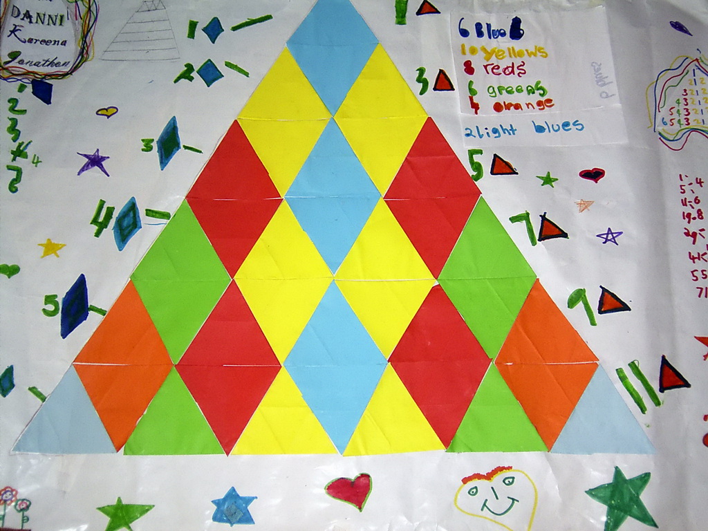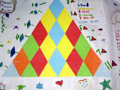 The children had learnt how to fold paper to make equilateral triangles. Lots of learning related to shape, symmetry, angle and so on, and lots of fine motor skill practice. A simple way to do this can be found at this link on the Nrich site in Britain.