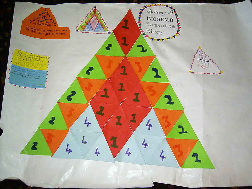 Building on the children's experiences with folding paper to make equilateral triangles, this investigation explores visual patterns made with them. Then they hunt for numbers in the patterns because, wherever there is a visual pattern there will be a number pattern and vice versa.