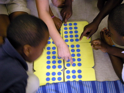 As children think they have calculated, they write their answer on a piece of paper and check it with someone else who is sure. When all children have had the chance to calculate, gather around the floor model again and discuss the strategies used.