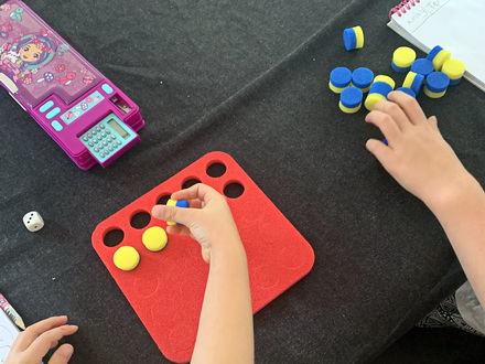 - Once a hypothesis has been checked by counting in, players say together Look we have made ... (in this case) ... five plus five equals ten, pointing at the board as they speak.