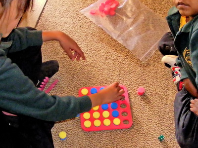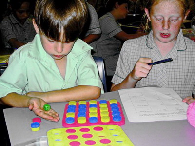 In school this game is played with the school resource called Poly Plug. At home you can play it with your plastic screw caps from soft drink and spring water bottles on a game frame, or by using a game sheet and crossing out circles as you go.