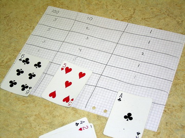 - Two set of playing cards (one red and one black) showing Ace, 2, 3, 4, 5, 6 - one for each player - Ace is worth 1