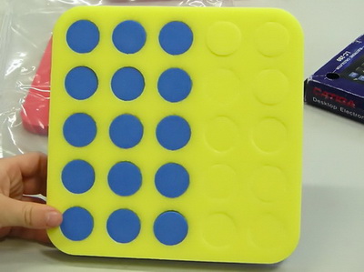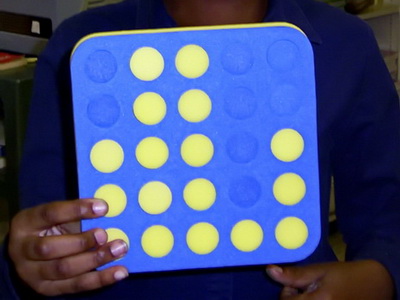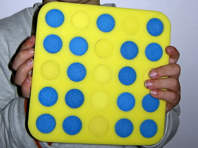 Plastic screw caps from soft drink and spring water bottles will fit the circles. Collect at least 10 in each of two colours. The board and the caps are a substitute for the school resource called Poly Plug. Buttons are also a possibility, even pebbles of similar sizes, if you have enough in two colours. If you think of something else that works let us know.
