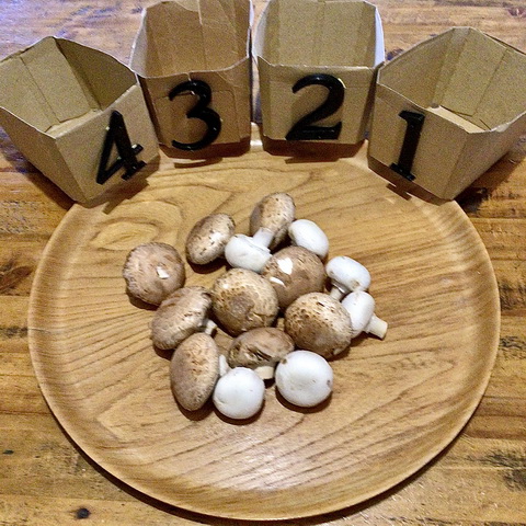 I had heaps fun with the Mushroom Hunt activity with my children! ... In my version of the activity, I gave the children 4 baskets and 15 mushrooms. ... The baskets are Aldi fruit packing boxes (I like to reuse and recycle) and the numbers are plastic house numbers I purchased from the hardware as a tactile resource for my children. ... It was so much fun watching the children work together to find out the solution and to see them make connections and links themselves.