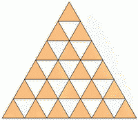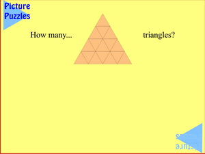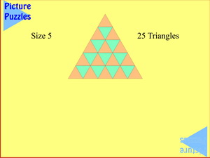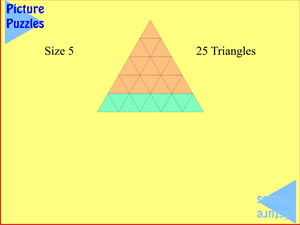 Based on Task 48, How Many Triangles?, students learn that an equilateral triangle made from unit equilateral triangles also contains triangles of other sizes. That is, the biggest triangle and the unit triangles are obvious, but you have to learn to 'see' the other size triangles. To add to the difficulty, some have their points up and some have their points down. Students learn to count all the triangles in a picture and discover that there is a way to predict the number of triangles of each size within any large size triangle.