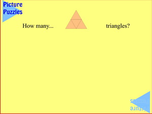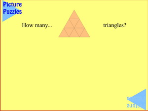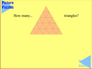 While this puzzle may have a similar structure to How Many Squares?, it is more difficult spatially. The tricky part is the Point Up and Point Down triangles and it isn't until the mathematician's strategy of breaking the problem into smaller parts is applied, that patterns are revealed. In fact, it is not only breaking the problem into different size triangles that matters, but breaking each of these further into Point Up and Point Down triangles.