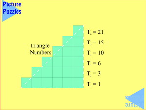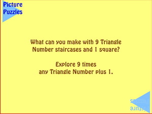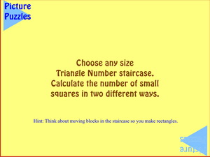 The final part of this Picture Puzzle encourages generalisation to any size triangle and the description of this generalisation in algebraic symbols.
