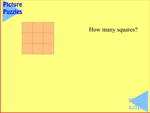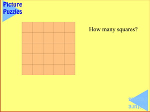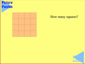 Based on Task 108, How Many Squares?, students learn that a square made from unit squares also contains squares of other sizes. That is, the biggest square and the unit squares are obvious, but you have to learn to 'see' the other size squares. Students learn to count all the squares in a picture and discover that there is a way to predict the number of squares of each size within any large size square.