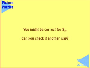 Maths300 members could explore this in Lesson 138, Pyramid Puzzle & Other Algebra Excursions. It is also important at this level to notice that none of the demonstrations in this Picture Puzzle is a proof. Asking the mathematician's question Can I check this another way? in senior secondary school can open the door to introducing Mathematical Induction and its role as a tool for proof of all cases.