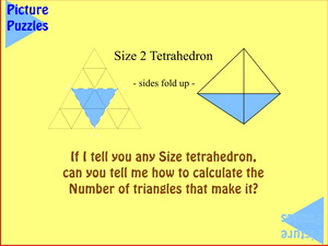 Based on Task 186, Tetrahedron Triangles, students learn more than one way to count the unit triangles within an equilateral triangle. In the additional challenge they discover that certain sizes of these equilateral triangles of triangles can be thought of as a net that folds into a tetrahedron. They are challenged to state a generalisation linking the size of the tetrahedron and the triangles in its surface area - in effect, measuring the surface area with unit triangles.