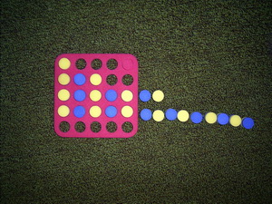 Each pair (or group of four) needs two colours of counters, beads or blocks. Since the problem refers to Colours A and B it doesn't matter it is not necessary for different groups to have the same colours. However if you have Poly Plug the yellow/blue plugs are perfect. You might plug into the red board to show the seasons, but you will soon run out of board space. You might like to tell the story of Mungo's growth using this image of Mungo in the background on your interactive whiteboard. Start the problem by demonstrating the growth rules at a central space, and ask students to go on building 'seasons of Mungo'.