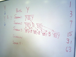Patterns in this table encourage prediction of further growth which can be confirmed, at least for Seasons 4 and 5, by construction. After 10 seasons (Season 9 in the table because we start at zero), the total number of rings will be 1023 and the colours will be made of two consecutive numbers that sum to 1023, that is, 512 for Colour A and 511 for Colour B. Interestingly older students might make such a calculation by application of index laws, but younger children can still access the arithmetic using doubling, perhaps with the help of a calculator. But a mathematician might ask why these patterns occur in the problem. How do they relate to the rules of the problem? Encouraging students to explain in words (and diagrams) in their journal can lead to recognising that: