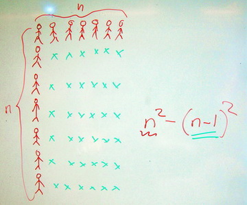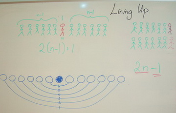 Lining UpTask 11 ... Years 2 - 8SummaryYou are told where you are in a line, ie: which position from each end. How many people are in the line?This cameo has a From The Classroom section which offers a unique view of the problem that helps to explain the difference of two squares formula. Lining Up also appears on the Picture Puzzles Pattern & Algebra B menu where the problem is presented using one screen, two learners, concrete materials and a challenge. |