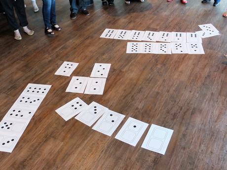 Teachers were introduced to Floor Dominoes in this segment of a six day professional development program. It was the Day 5 and they had become used to working from an open starting point. There were enough teachers so that each person had their own floor domino to contribute to the group challenges.
