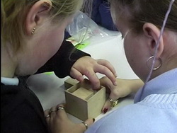 Pack The BoxTask 20 ... Years 2 - 10SummaryFirst make the box. it will be a cube. Instructions are provided and it need only be done once and held with tape. Then the challenge is to fit six identical blocks inside the dimensions of the box. There is enough space... They should fit ... but it is so ... infuriating!Note: This is an Ikea-style task. It is shipped flat-packed. Teachers are expected to make the box first and tape it together. Otherwise students have to struggle to hold the box together and solve the problem at the same time, as in the photos below. |