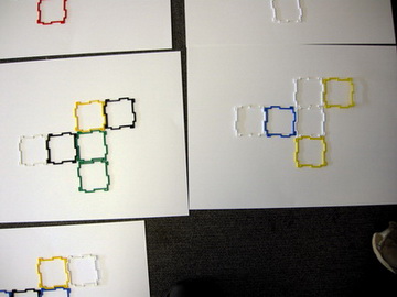 The best way to turn this task into a whole class lesson is to have sufficient 3d Geoshape Squares (at least 200). Then the lesson begins by everyone making a cube and unfolding it so that: