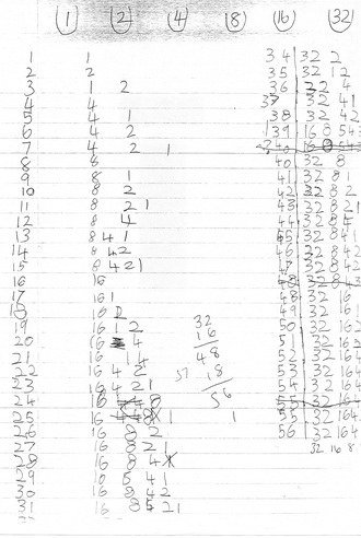 ![]() This journal page from an unnamed Year 3 student at Crawley Ridge Junior School, Surrey, confirms that even young children enjoy chasing patterns when they 'own' a problem. This student is not far from being interested in converting these answers to binary numbers which record the baskets used to make a solution. |