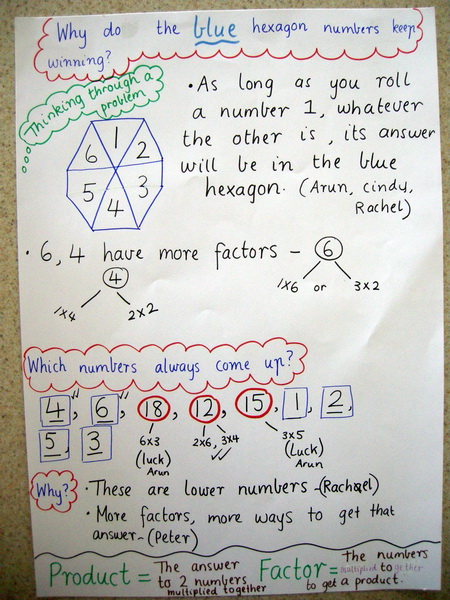 To turn this into a class investigation only requires multiple copies of the hexagon board and two dice per pair. The advantage of doing so is the swift collection of much more data, which means more firmly based hypotheses than are possible with only two students investigating. It doesn't take long for the class to see that the Middle hexagon is more likely to 'win'. It takes a little longer to find out why. It then becomes a considerable project to decide on the fairest way to redistribute the numbers to make three (almost) equally likely hexagons. Maths300 provides software that makes this project more manageable and efficient. If you have Poly Plug, the red plugs make excellent counters for the activity. To see an example of the exploration in one class, see Learners At Work below. For more ideas and discussion about this investigation, open a new browser tab (or page) and visit Maths300 Lesson 6, Have A Hexagon. This lesson also includes Investigation Guides and software to extend the investigation. Visit Have A Hexagon in Menu Maths Pack C. |
