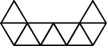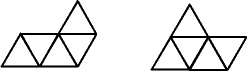 Three in a row The value of $3.30 in Question 3 implies shapes made with 6 equilateral triangles at 55¢ each. These are the hexiamonds. The full set can be found by beginning with the four pentiamonds above and finding all the ways of adding one more triangle. There are 12 altogether, one of which is the Sphinx. Students may like to assign names to the others. The shape in Question 4 uses nine equilateral triangles. Since this is an odd number, one of the triangles must somehow be in the 'middle' to maintain symmetry. Some solutions are: