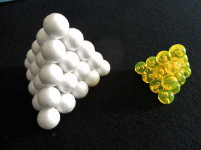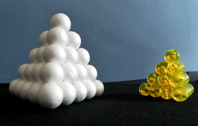 It is sometimes remarkable how much more mathematics students see when their hands are holding the object of mathematical inquiry. You may be tempted to generate a whole class investigation of this problem based on it being used by various groups in previous task sessions, or perhaps even from drawings, but there is no real substitute for a class set of Pyramid Puzzles. (Unless, perhaps, you have access to a snooker triangle and enough balls to build a pyramid above the balls usually supplied.) Some craft shops supply polystyrene spheres. With a bit of glue (and perhaps some bamboo skewers through the balls to make them stronger) it's easy to make the 4 piece and the 6 piece. Perhaps students can help make enough pieces for a class set. The general outline of the whole class investigation is above. More detail, including formulas for the sums of Natural Numbers, Square Numbers and Triangle Numbers, and proofs by Mathematical Induction can be found in the companion Maths300 lesson. For more ideas and discussion about this investigation, open a new browser tab (or page) and visit Maths300 Lesson 138, Pyramid Puzzle & Other Algebra Investigations. |