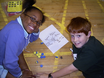 Using the students as 'buttons' is a great way to begin this lesson outdoors. Ask them to walk around in an enclosed space (such as the netball court) and on your signal make groups of a certain number. Record the number of groups of this size and the left overs. No-one is out, so, with the same number of students, repeat the activity five or six times. Return to the classroom where students use Poly Plug, or an alternative, on their desktop to make a 'table top model' of the outdoor experience and gather data for other possible groups 'called by the teacher'.