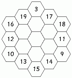 Magic HexagonTask 190 ... Years 4 - 10SummaryAs the history on the card suggests, this puzzle has been well know to mathematicians. In part, the reason is that it is difficult and Mathematics just love a challenge. (a quote from Andrew Wiles in Fermat's Last Theorem, a BBC Horizon documentary). Hints are given on the card and it is important that they are covered, as instructed. The fewer hints students use in the solution, the more satisfaction they will have when solving it. But don't expect that solution to happen in one session.Related tasks using the same reasoning strategies are: |