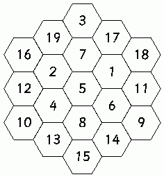 Possibly the best way to turn this task into a whole class lesson is within a unit which includes Magic Squares, Fraction Magic Square and Magic Cube. These all highlight breaking a problem into parts and trying every possible case. Magic Hexagon can be the challenge near the end of the unit to see how well skills are transferred to a new situation. As suggested above, it could be a paper and pencil exercise, but it is far less frustrating to use counters. You need a set numbered from 1 - 19 for each pair, and it doesn't take long to produce them. Each pair also needs a hexagon grid. Present the problem as a possible outcome of a mathematician successfully working with Magic Squares and asking What happens if we have a different shape of grid?. Could we make it magic? Ask the students to tell you how many digits would be needed if the problem was going to work and then hand out the sets of counters and the grid. What did we learn from Magic Squares that might start us off in this investigation?Continue from here being careful to minimise the clues you give and to maximise the opportunities for sharing and peer teaching across the class. At this stage, Magic Hexagon does not have a matching lesson on Maths300. |