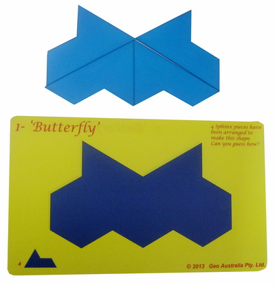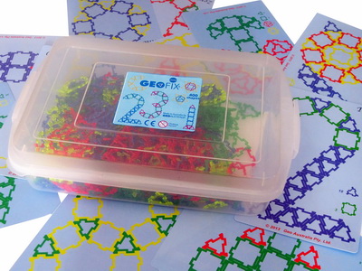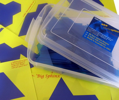 - Geo Sphinx Kindergarten is 80 crystal blue pieces + 8 double-sided plastic activity cards & instructions in a handy storage box with clip-on lid.