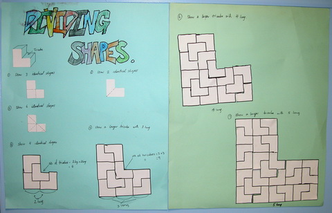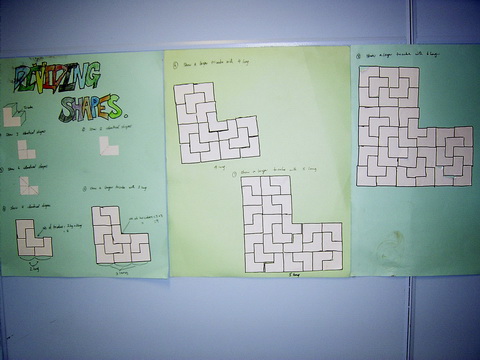 This group of students were not known for their efforts in mathematics, but Task 115, Dividing Shapes, caught their imagination and led to this amazing work with 'home made' Trisquares. As the Trisquares grew so did the students understanding of number patterns, number pairs, graphing, perimeter and area. |