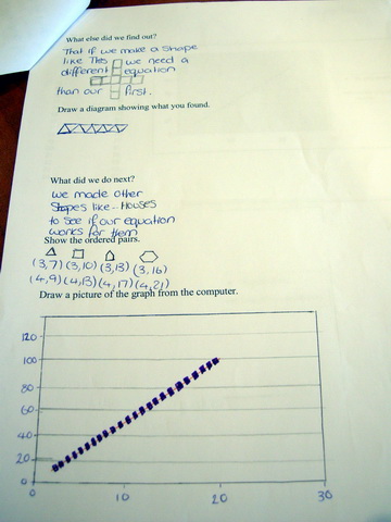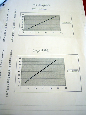After this they were asked to make different shapes, come up with formulas for them, then test their formulas. All results were recorded on the board and ordered pairs were made for triangles, squares, pentagons and hexagons. These were entered onto an Excel spreadsheet and then graphed.
