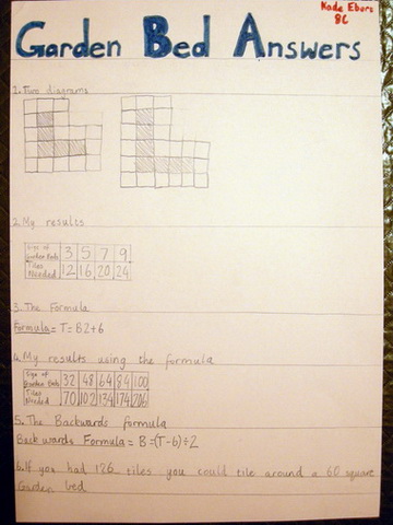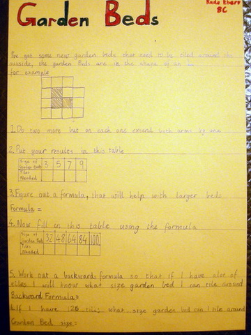 The three week unit was very much worthwhile. It made me restructure the way I teach and has benefitted the students in the way they approach tasks. The evidence for our success is our Algebra Topic Plan. Students are writing about their maths and their writing has improved as we have done more investigations. I would like more time to plan and execute units like this.