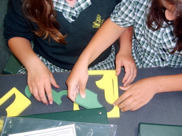 String Shapes begins outside with each group of 6 - 8 students sharing a large loop of string and a set of Polygon Pages. One student is Recorder. Students have to create a large string version of the polygon on the page and find ways to test the accuracy of their model. Inside, class discussion begins to uncover measurements and features that are the properties of particular shapes. Greg added to the lesson by asking each group to take apart their polygon booklet and find out as much as they could about the shapes on the pages they received. This collected wisdom was then turned in as a group report. More detailed discussion followed as a class before the students were issued with a new booklet each and challenged to complete at least 4 pages with as many properties as possible about their chosen shapes. Many students chose to complete the whole booklet. The text book work on polygons and properties was a breeze after this investigation.