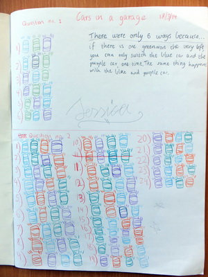Remember, these photos were taken during the first 50 minutes task lesson. These examples and the one in the photo at the top of the page in which the two girls were working on Task 192, Keith's Kubes, show that recording can be introduced in a way students accept as a natural part of a mathematician's work. It also offers an opportunity to encourage and value individual presentation skills.