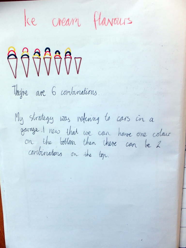 Chloe working on Task 118, Ice Cream Flavours and showing the mathematician's strategy of learning from a previous problem.