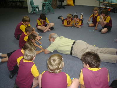Next morning, before the Millaroo kids arrived, I reviewed what the children thought they had learnt the day before. In the process the children asked if they could try the problem again with people. Every one of them wanted to show they could do it. They agreed they would introduce it to the other kids at the end of the day. Then, with great confidence, Daniel asked "Can we try it with five?". That was an eye-opener for them. They couldn't do it, and knew that we would come back to this problem again.