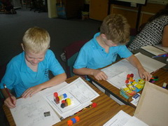 The physically involving start to this investigation works so well. Students have to use classmates' names to tell them who should turn and I thought this would help rebuild relationships in the first hour of this new year. We couldn't solve the problem this way, so moved to making a model with John's Poly Plugs. It took a while, probably 20-30 minutes, and the Year 1s drifted into 'free time' activity, but pairs began to find a solution. Gradually they developed a pattern of movement that solved the initial problem and, while the Year 1s played the calculator game Six Plus (from Calculating Changes) with John, we recorded all we had learnt in our new maths journal. |