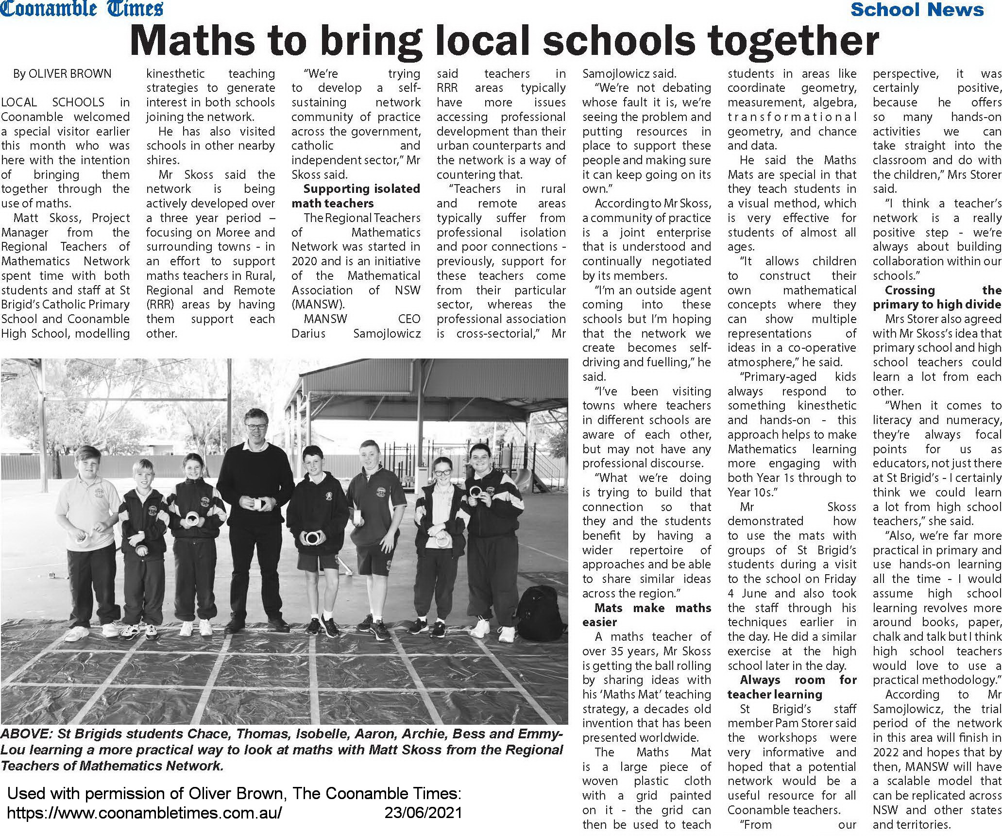 Matt was captured by The Coonamble Times presenting a mat workshop in regional NSW as a part of a project of the Mathematical Association of NSW (MANSW) to support rural, regional and remote teachers to build local, self-driving, professional development networks.