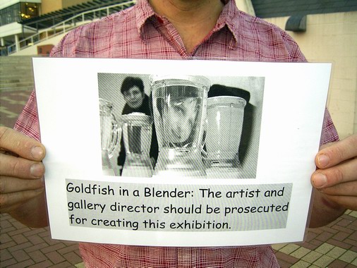 The artist set up many blenders, each with a goldfish in water, and gave the public the right to press buttons if they wished. Several goldfish were minced.