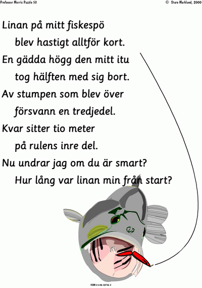 Sture Marklund, a grandfather and teacher of Grade 4 in remote Sweden, became interested enough in Professor Morris Puzzles to recreate this one in Swedish. It is the same puzzle as above, but the story is about a fisherman who has to deal with a pike which is cutting up his line. It is clear, even if you don't know Swedish, that Sture believed the rhyme and rhythm of the puzzle, as well as context, would contribute to engaging his students.