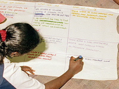The model is a lesson in itself, not 'squeezed in at the end' of the investigation lesson. It can be adapted to any year level and any investigation. In the photo, the class is involved in the whole class investigation of Task 45, Eric The Sheep.
